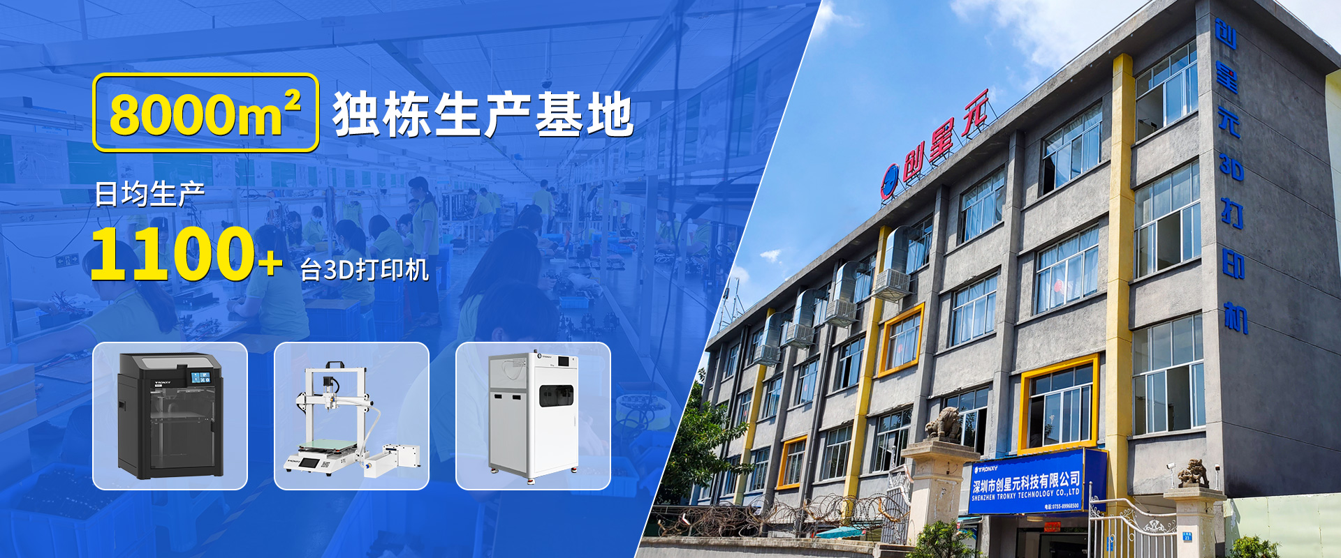 自主設計,定制生產線,可生產從桌面級到工業級等 尺寸從180mm到1.6米的3D打印機